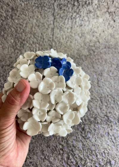 Inspired by hydrangea blossoms, this piece captures the perpetual delicacy of nature in porcelain. Each flower is shaped by hand, layered into a rhythmic cluster where white and cobalt blooms meet. The clear glaze enhances the quiet radiance of the surface, holding stillness in a form that feels both intimate and timeless.