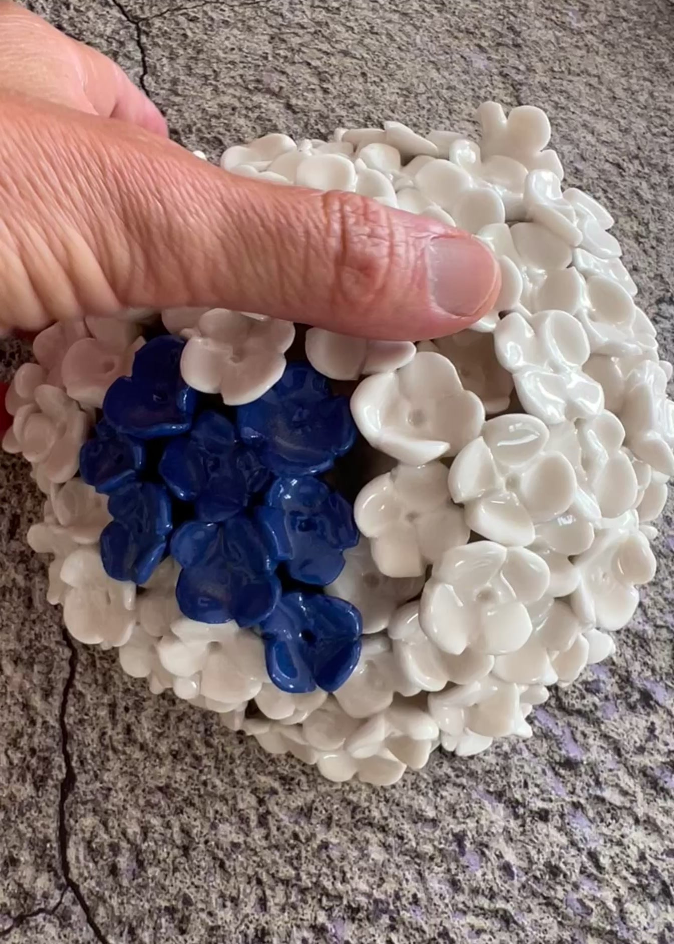 Technique: Slab-rolled base and hand-sculpted hydrangea flowers, high-fired