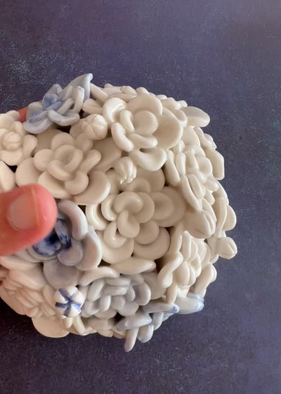 Bloom in Stillness III is a sculptural porcelain composition inspired by succulent clusters, where resilience meets delicacy. Each petal is shaped and attached by hand, creating a living surface of flowing forms. Accents of cobalt bring quiet contrast, highlighting the timeless beauty of organic growth. This piece celebrates permanence within fragility, offering a contemplative presence that shifts with light and shadow.