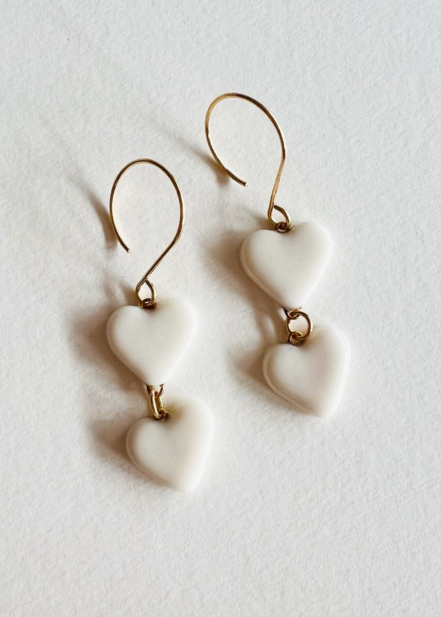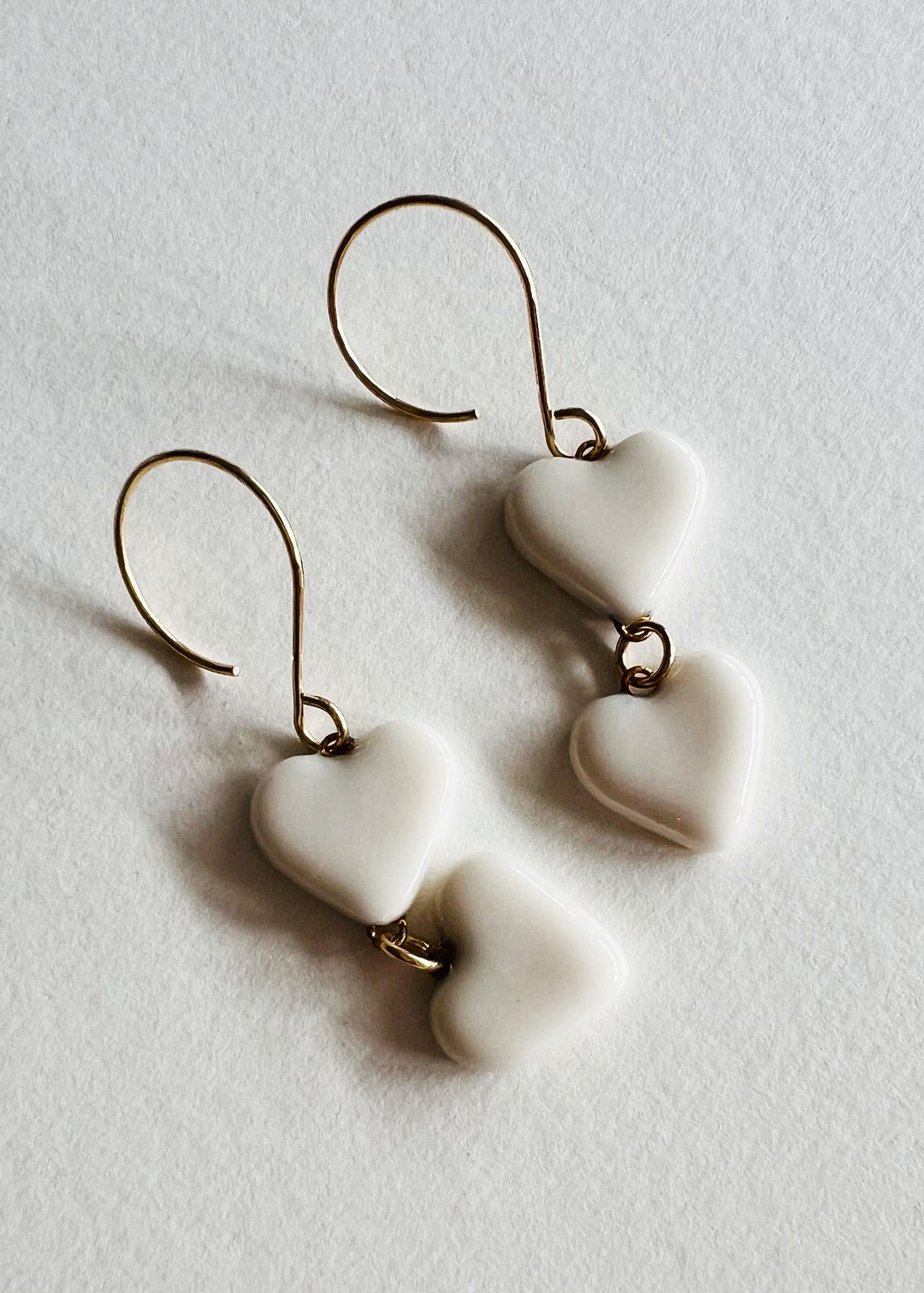 Made from high-quality porcelain, these handmade earrings feature a charming heart shape that delicately moves with your every step. Expertly crafted, these earrings are a unique and timeless addition to any jewelry collection. Enhance your style with the elegant and playful Heart Duet earrings.