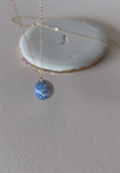 Its unique blue and white spherical pendant is an eye-catching accessory that makes a bold statement. Add a touch of sophistication to your wardrobe from the Sidera collection. Made in California.