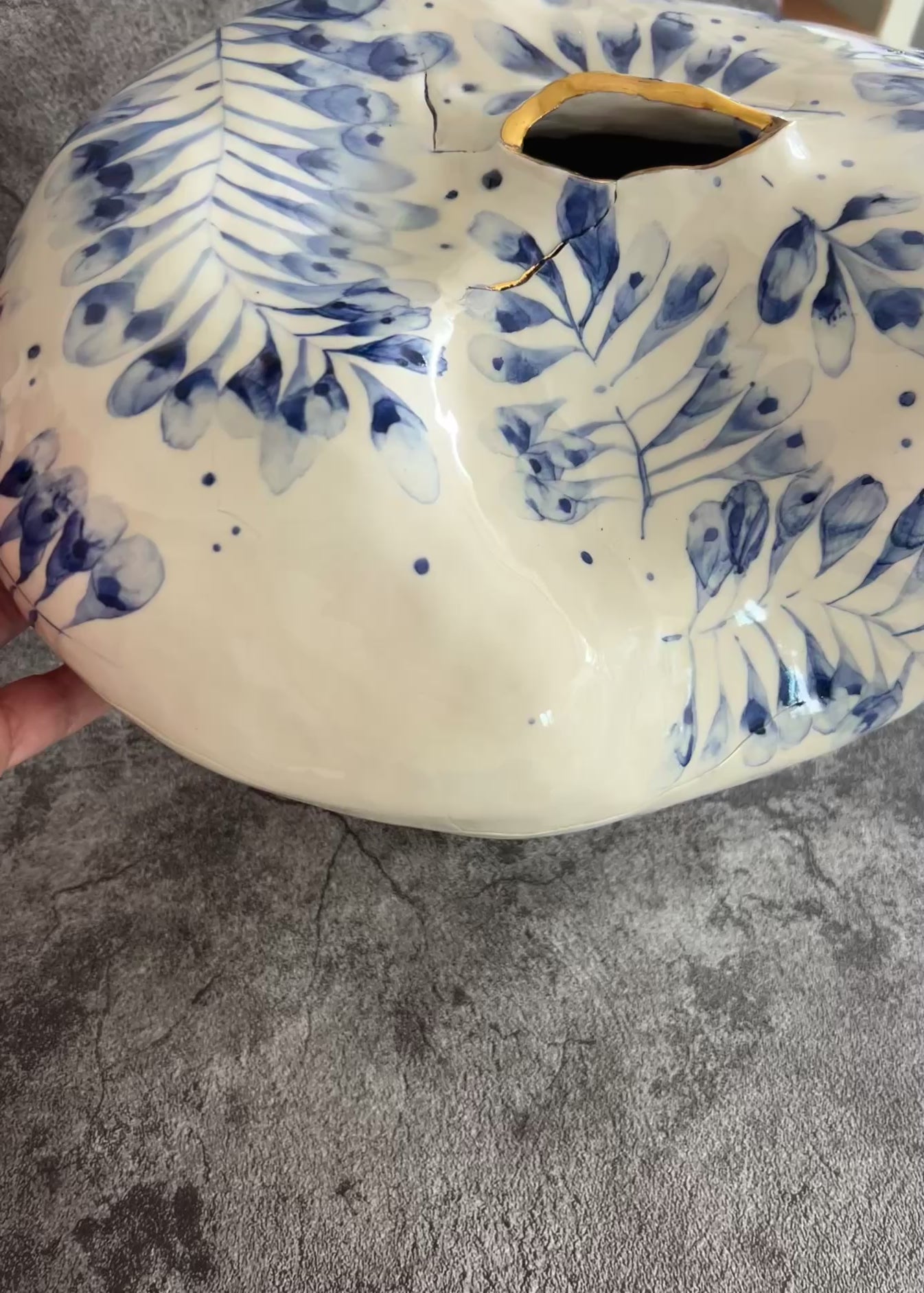 Delicate fern-like patterns flow across the porcelain surface, interrupted by a fracture gilded in gold. Wound of Time II embraces its imperfection, transforming it into a mark of resilience and beauty — a visible reminder that what is broken can become more luminous.